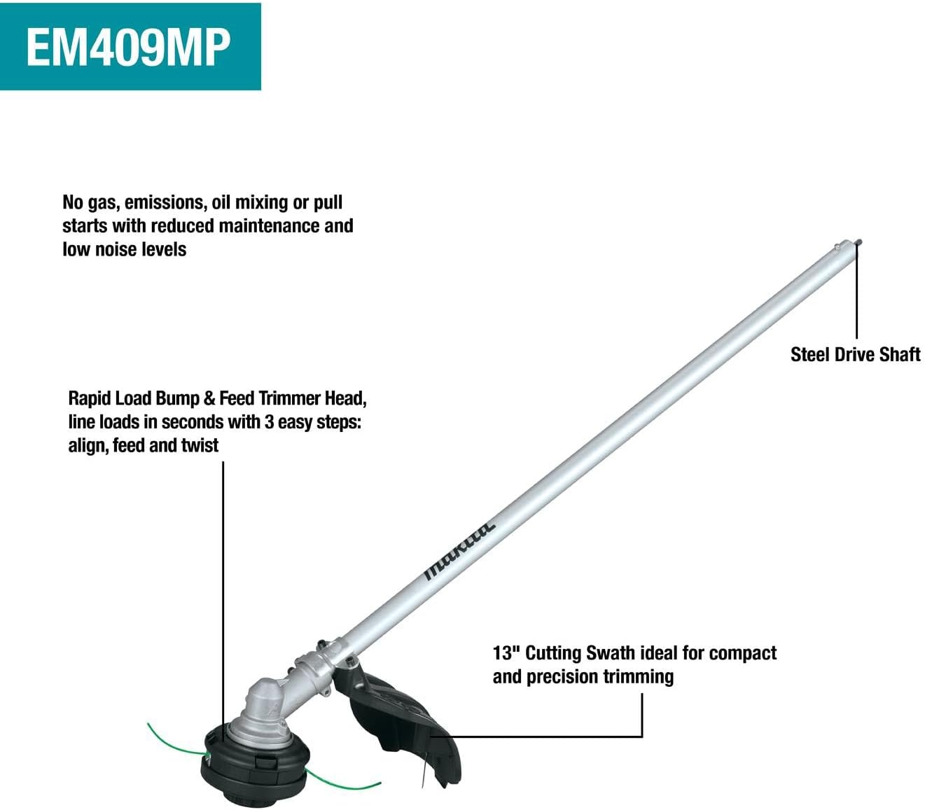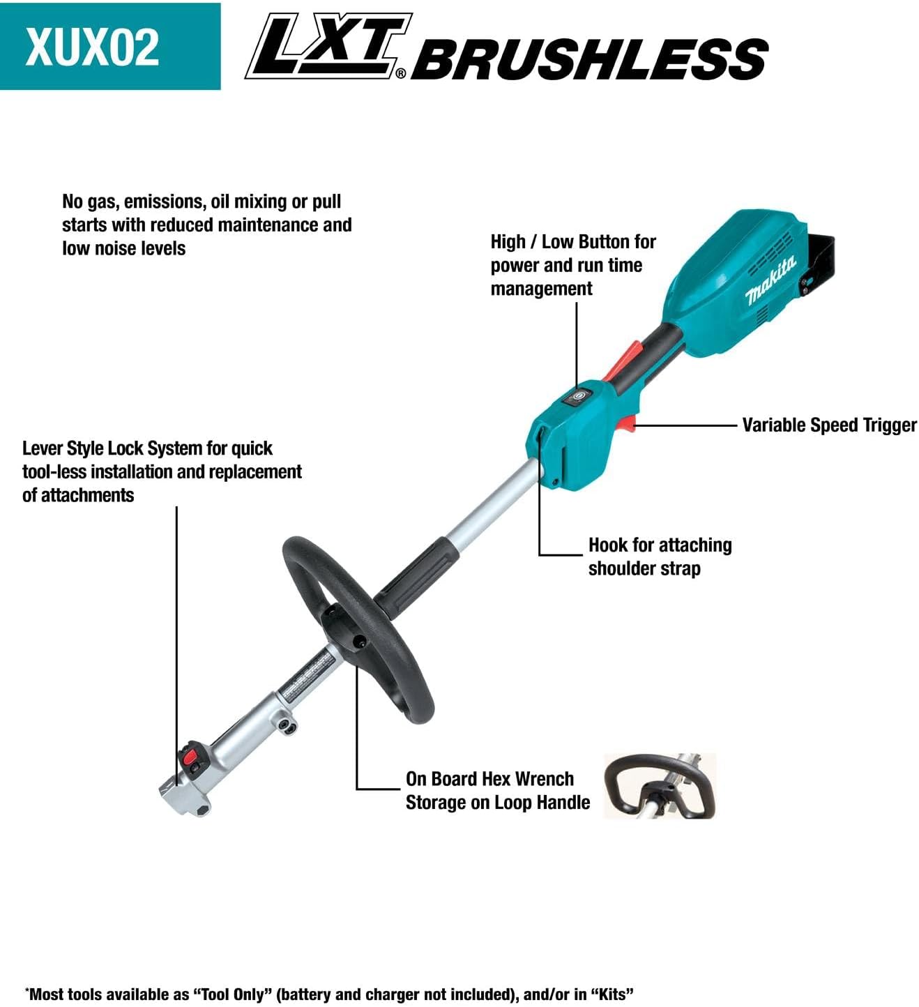 ראש הכוח כולל מערכת נעילה בסגנון מנוף להתקנה והחלפה מהירות וללא כלים של אביזרים. המנוע ברשלס שבנה Makita מספק עד 7,000 סל"ד עם אביזר גוזם חוטים בגודל 13 אינץ'. אביזרי גוזם החוטים בגודל 13 אינץ' כוללים ראש גוזם מהיר עם טעינה והזנה, שטוען את החוט תוך שניות ב-3 שלבים פשוטים. למפוח המפוח עיצוב מאוורר בקו ישר לאיזון טוב יותר של הכלי ולארגונומיה משופרת. תכונות נוספות כוללות הדק במהירות משתנה. הוא כולל את טכנולוגיית Makita Extreme Protection Technology (XPT™). XPT™ הוא אטם מגן בתוך הכלי. הוא נועד לשפר את פעולת הכלי בתנאים קשים על ידי ניתוב מים ואבק מרכיבים פנימיים מרכזיים.