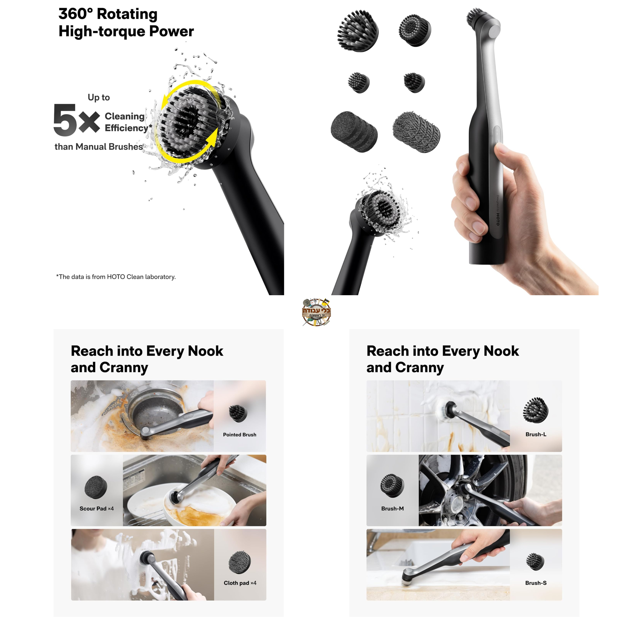 מברשת חשמלית נטענת HOTO Wand™ לניקוי רב תכליתי כולל חדרי אמבטיה, מטבחים ורובה
